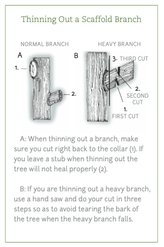 The thinning out cut is used to remove a branch completely. This is primarily used to increase air circulation in the canopy. In this technique, you will choose entire branches and remove them close to the trunk. Branches that emerge from the trunk are called scaffold branches.